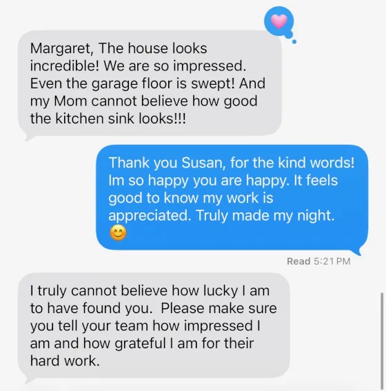 “Margaret, The house looks incredible! We are so impressed. Even the garage floor is swept! And my Mom cannot believe how good the kitchen sink looks!!! I truly cannot believe how lucky I am to have found you. Please make sure you tell your team how impressed I am and how grateful I am for their hard work.” Susan